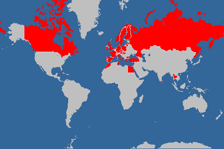 Ägypten, Bermudainseln, Bulagarien, Dänemark, Dominica, Finnland, Frankreich, Gibraltar, Griechenland, Großbritannien, Irland, Israel, Italien, Kanada, Kroatien, Kuba, Lettland, Litauen, Malta, Marokko, Niederlande, Norwegen, Österreich, Polen, Portugal, Russland, Schweden, Schweiz, Schweiz, Slovenien, Slowakei, Spanien, Sri Lanka, Thailand, Tschechien, Tunesien, Türkei, Ungarn, Zypern